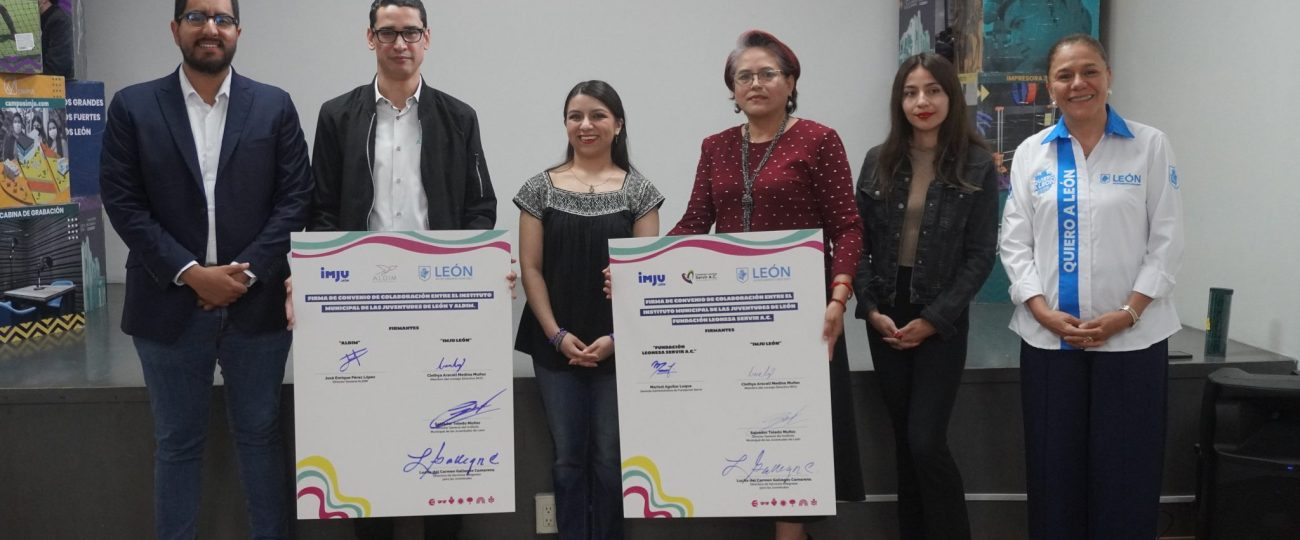 León, Gto.- Con el objetivo de promover la inclusión y el desarrollo integral de las y los jóvenes con discapacidad, el Instituto Municipal de las Juventudes de León (IMJU León), firmó un convenio de colaboración con la Asociación Leonesa para la Distrofia Muscular (ALDIM) y la Fundación Leonesa Servir A.C